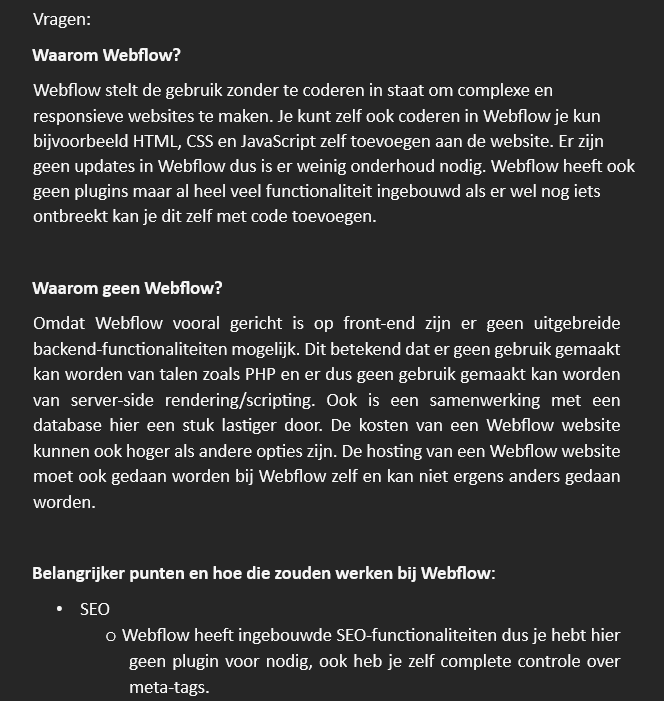 De opdracht was om een nieuwe website te maken voor het midden- en klein bedrijf (MKB) van MCXess ik heb alleen aan het begin van dit project geholpen. Ik heb in de tijd dat ik hier aan heb gewerkt vooral onderzoek gedaan en presentaties gegeven. Ik heb onder andere onderzoek gedaan naar lead API’s en AI FAQ’s. Daarnaast heb ik een CMS aangewezen gekregen namelijk Webflow en ik heb daar onderzoek gedaan of wij dit CMS zouden kunnen gebruiken voor de website. Dit deed ik samen met 4 andere stagiairs.